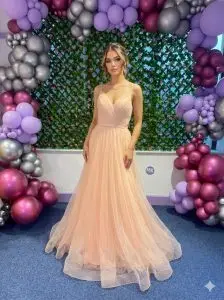 Sheridan is a romantic tulle A-line prom dress with a pleated V-neck bodice, slim straps and a soft sweep of skirt that moves beautifully on the dancefloor. Available in Blush Pink and Lilac, it pairs a flattering V-back and secure zip with lightweight comfort so you feel as good as you look all night.