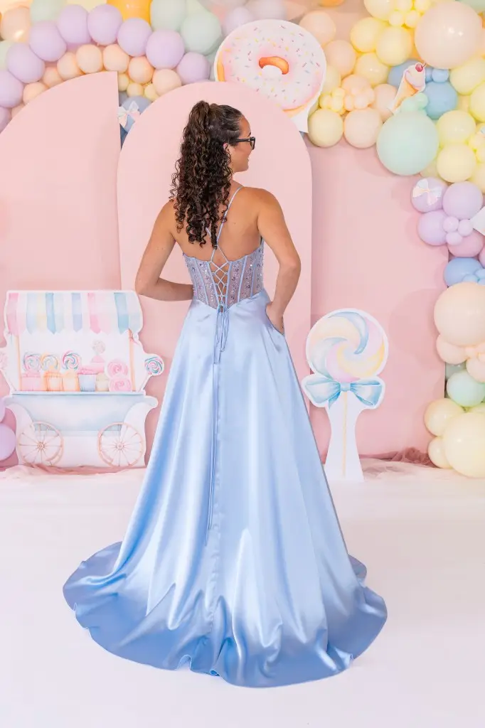 Kelly serves soft satin shine with a sweetheart corset bodice, delicate straps and a flowy A-line skirt with thigh split—proper prom glam without the faff. Available colours: Ice Blue.
