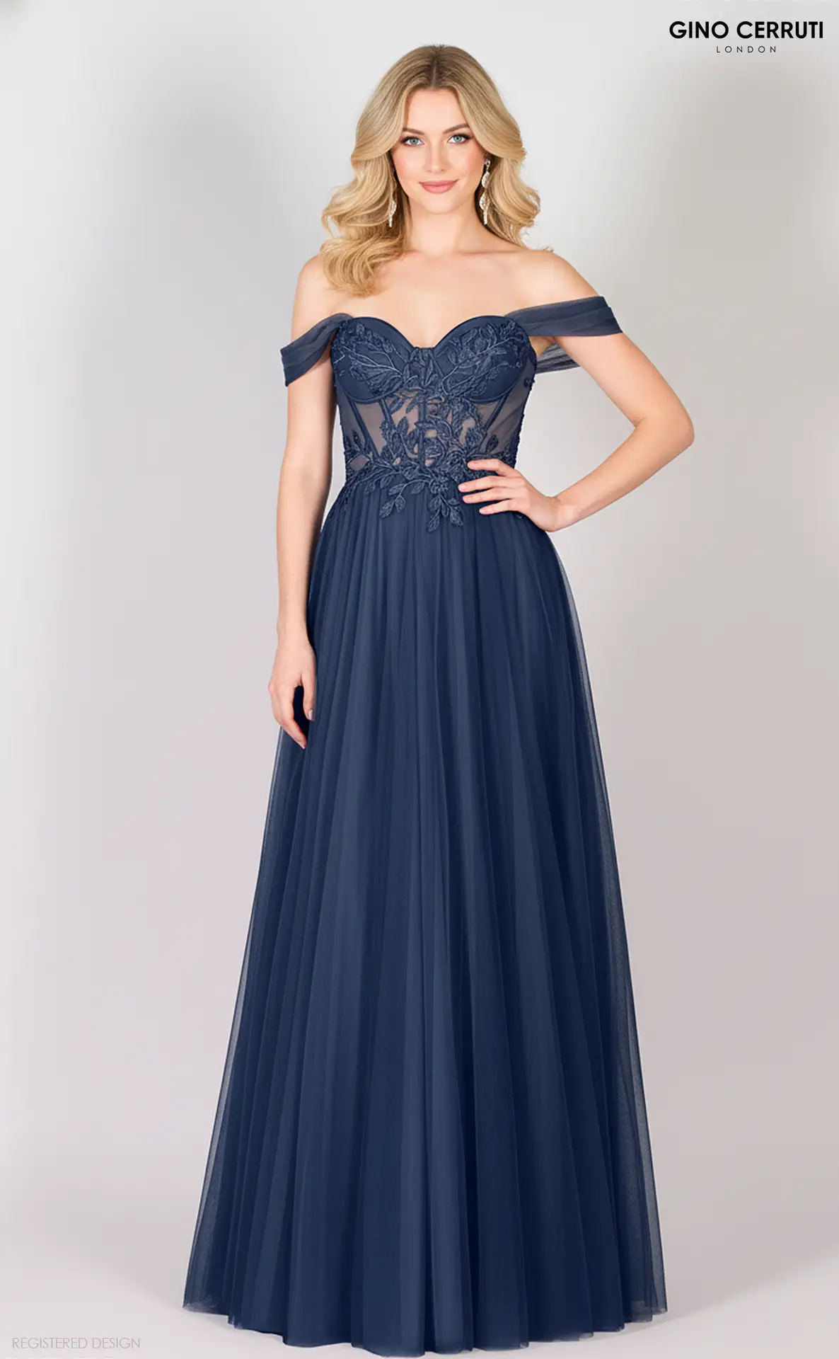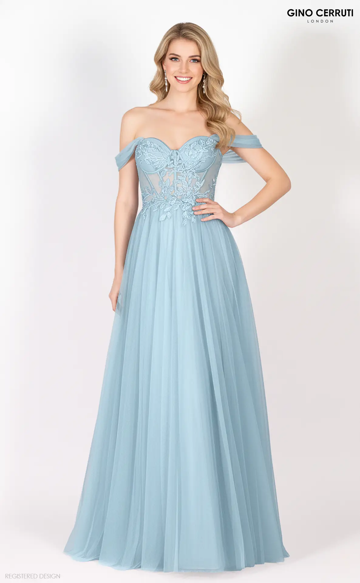Mirina is a dreamy off-the-shoulder prom gown with a corset-style lace bodice, sweetheart neckline and a floaty tulle A-line skirt that looks gorgeous from every angle, available in Baby Blue, Red and Navy.