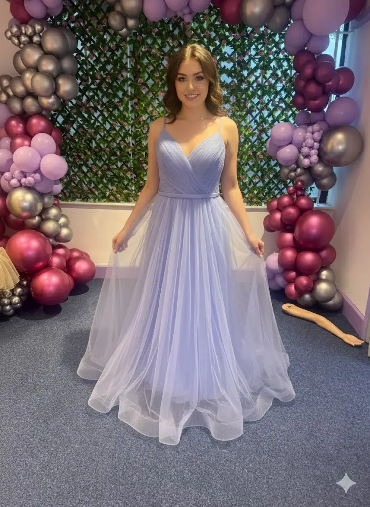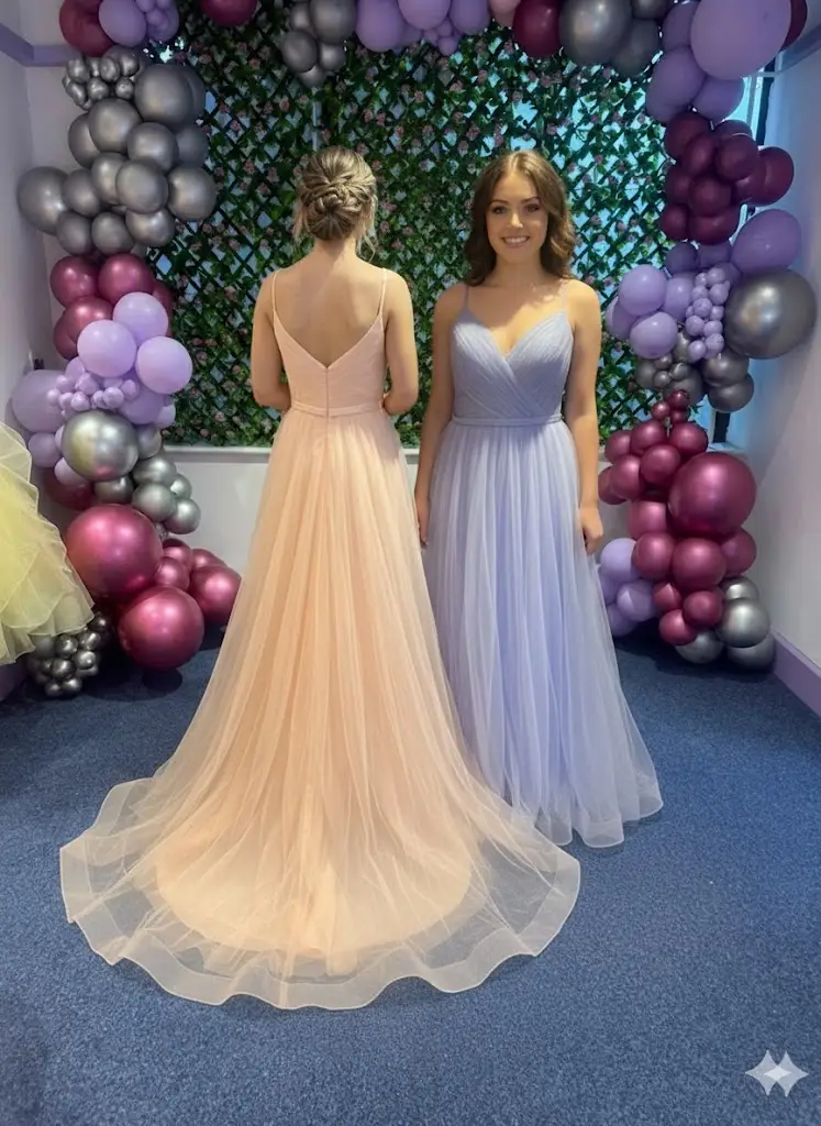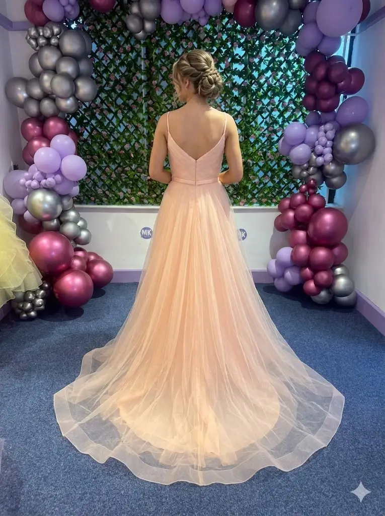 The Sheridan skims from a fitted pleated bodice into a full tulle A-line skirt, giving shape at the waist while staying easy to move in, with a gentle sweep train on the blush shade for that little bit of red-carpet drama. Slim spaghetti straps and a V-back with a secure zip keep everything feeling safe and supported, while the soft lining means no scratchy seams, so you can style it simply with a sparkly belt or earrings and stay comfy right through to the last dance.